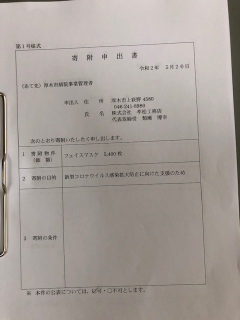 今般マスクを大量に購入することが出来ましたので、日頃お世話になっている厚木市へ貢献をしたいと思い、新型コロナウイルスとの戦いで頑張っておられる厚木市立病院へ寄付させていただきました。少しでもお役に立てれば幸いです。